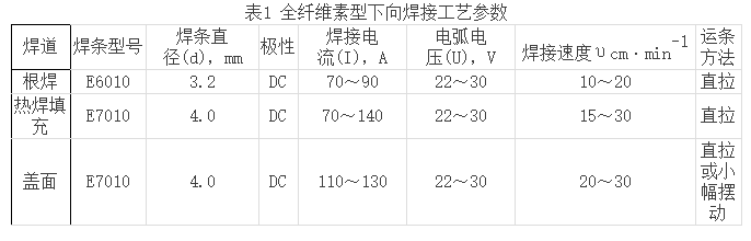 全纖維型下向焊接工藝參數(shù)見表1。該工藝的關鍵在于根焊時要求單面焊雙面成形;仰焊位置時防止熔滴在重力作用下出現(xiàn)背面凹陷及鐵水粘連焊條。我國早期的下向焊均是纖維素型。
