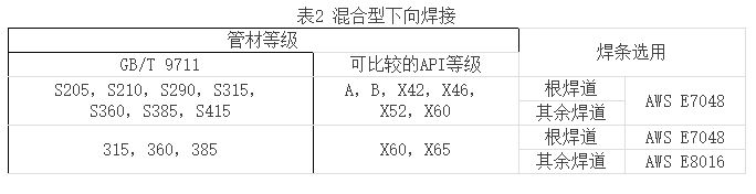 混合型下向焊接是指在長輸管道的現(xiàn)場組焊時,采用纖維素型焊條根焊、熱焊,低氫型焊條填充焊、蓋面焊的手工下向焊接技術。主要用于焊接鋼管材質級別較高的管道。
