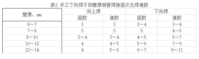 20世紀90年代末期,大壁厚管材廣泛應用國內外油、氣和水電工業(yè)長輸管道中,水電工業(yè)的壓力管道中一般管徑達1m以上,壁厚達10~60mm,在我國北方寒冷地區(qū)油氣管道壁厚也達到10~24mm。與傳統(tǒng)的向上焊相比,由于下向焊熱輸入低,熔深較淺,焊肉較薄,隨著鋼管壁厚的增加焊道層數(shù)也迅速增加,焊接時間和勞動強度隨之加大,單純的下向焊難以發(fā)揮其焊接速度快、效率高的特點。手工電弧焊不同壁厚鋼管焊接層次及道數(shù)推參考表見表3。而根焊、熱焊采用向下焊,填充焊與蓋面焊采用向上焊的復合下向焊技術則可發(fā)揮兩種焊接方法的優(yōu)勢,達到優(yōu)質高效的效果。在半自動氣體保護下向焊接技術應用于管道建設之前,大壁厚管道多采用復合型下向焊接技術。如某工業(yè)園區(qū)輸水管道工程所用鋼管規(guī)格為1400mm×14mm,材質為Q235—A。焊接過程中根焊熱焊用纖維素焊條J425G(E6010),填充焊和蓋面焊采用普通E4303焊條,使焊縫焊道層數(shù)由單一下向焊所需的7~8層,減少為4~5層,焊接時間可縮短30min,大大提高了生產效率。