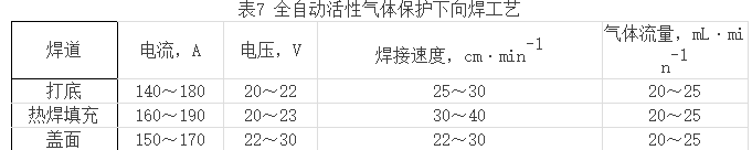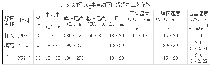 STT型CO2半自動焊以其優(yōu)異的性能拓寬了CO2半自動焊在長輸管道施工中的應用領域。中國石油天然氣管道局曾在蘇丹Muglad石油開發(fā)項目中首次使用了STT型CO2半自動下向焊接技術進行管道打底焊接,中原石油勘探局建筑集團公司正在施工的陜京管線復線京—石管線工程使用了STT型CO2半自動下向焊接技術,焊接工藝見表6。