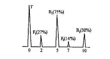 (2) 繼續(xù)加水至樣管直徑的1/2處,并保持探頭與人工缺陷相對(duì)位置不變,旋轉(zhuǎn)樣管使人工缺陷剛好浸入水中,此時(shí)波幅變化如圖5所示??梢?jiàn),降至滿幅的30% (-9.5dB), F1降至滿幅的20% (-3.5dB);B2和F2同樣全部消失。在水量增加,且人工缺陷也被水所浸的情況下,B1與F1較原始狀態(tài)下降幅度驟增,更加證明了水浸探傷時(shí)能量衰減嚴(yán)重。