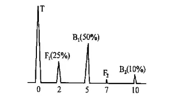 將探頭置于樣管上,找到人工缺陷,將一次通波B1調(diào)到5格,幅度為滿幅的90%,二次通波B2調(diào)到10格,幅度為滿幅的50%;—次缺陷波F1在2格處,幅度為滿幅的30%,二次缺陷波F2在7格處,幅度為滿幅的17%(圖1)。