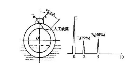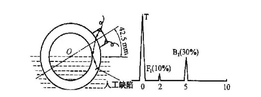 (3) 繼續(xù)旋轉(zhuǎn)樣管將人工缺陷完全浸入水中,此時(shí)探頭中心線距水面周向距離為42.5mm,波幅變化情況如圖6所示。可見(jiàn),B1與上種情況相同,為滿幅的30%,F(xiàn)1則降至滿幅的10%(-9.5dB),B1和F1均比原始狀態(tài)衰減9.5dB,由此可以看出水浸探傷能量衰減的嚴(yán)重程度。若樣管完全被水浸 沒(méi),能量衰減會(huì)更加嚴(yán)重。