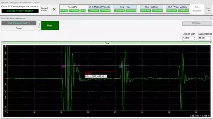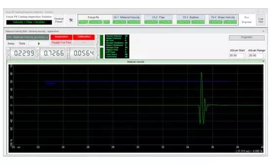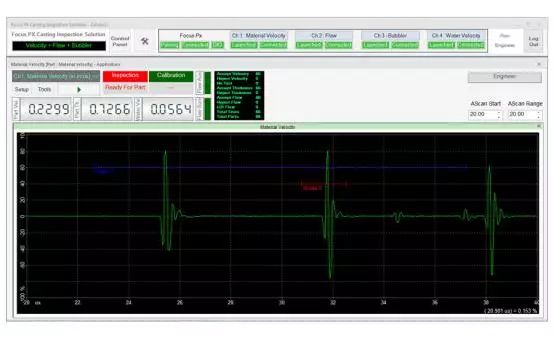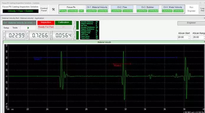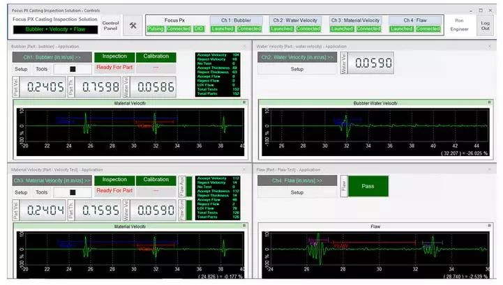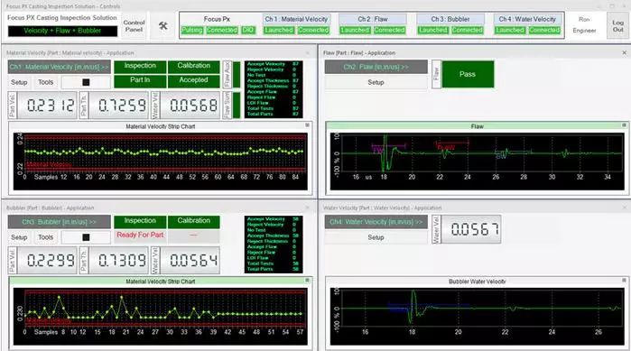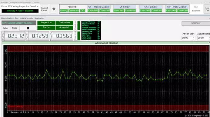 在檢測期間,可以通過用戶界面上的LED屏幕觀察檢測順序。接受/拒絕排序決定也會顯示在LED屏幕上,并在數(shù)字輸入/輸出總線上發(fā)出信號,顯示每個檢測鑄件的速度數(shù)值、厚度和水中聲速測量結(jié)果等信息。每個鑄件的測量值都會繪制在趨勢圖上。接受的和拒絕的零件數(shù)以及檢測的總零件數(shù)由用戶界面上的零件計數(shù)器進行計數(shù)和顯示。檢測結(jié)果最終可導出為CSV文件,用于離線文檔存儲和分析。
