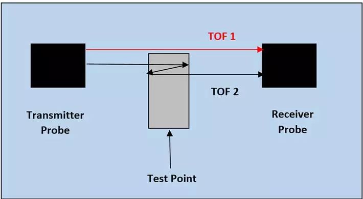 測量的基本原理如下圖所示。發(fā)射和接收換能器之間的超聲波飛行時間(TOF)通過水路測量得出(在裝置中不加鑄件樣品)(圖中的TOF1)。接下來測量出代表鑄件兩側(cè)水路的飛行時間以及聲波在鑄件中完成一次往返所需的時間(圖中的TOF2)。隨后根據(jù)測量部件的厚度和兩個測量的TOF值即可計算出聲波的傳播速度。