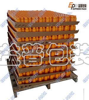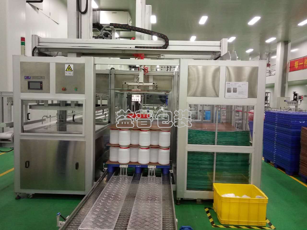 工作時(shí),塑料瓶通過進(jìn)瓶輸送線進(jìn)入碼垛機(jī),按照一定排列順序進(jìn)瓶,當(dāng)達(dá)到預(yù)設(shè)每一層空瓶數(shù)量時(shí),移載裝置將整層瓶子平移到垛板上,隔板供給裝置從隔板倉中取出隔板放置在碼垛工位,然后繼續(xù)下一層,重復(fù)上述動(dòng)作,當(dāng)達(dá)到預(yù)設(shè)層數(shù)時(shí),通過輸送鏈自動(dòng)將滿垛產(chǎn)品輸送。